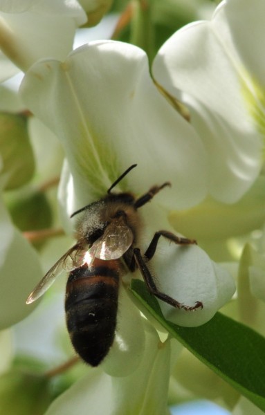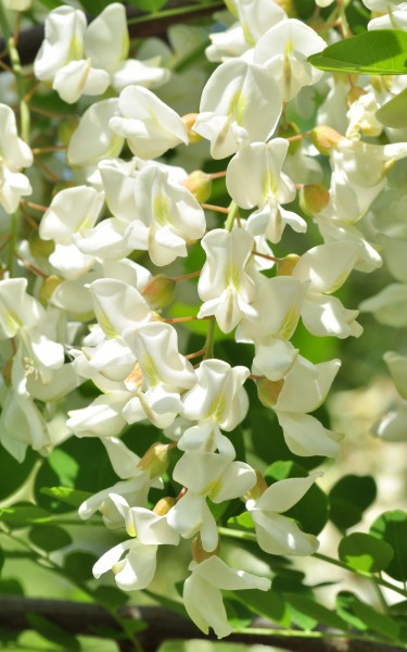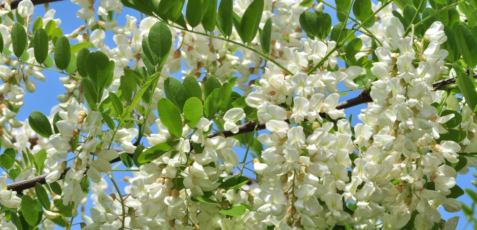 – Un avantage lorsqu’il est planté sur les talus abruptes dont il maintient la terre. Ceci est souvent le cas le long des lignes de chemin de fer et de certaines autoroutes. L’écorce du tronc se crevasse profondément avec l’âge. Les feuilles caduques, alternes sont composées imparipennées et à nombre important de folioles chez l’espèce type. Ces folioles sont elliptiques et entières. Les deux stipules qui accompagnent la base de chaque feuille sont à l’origine des épines qui persistent plusieurs années sur les jeunes rameaux et sur les branches plus âgées. Les fleurs en grappes pendantes apparaissent en mai à l’aisselle des feuilles des rameaux de l’année. Elles sont blanches et typiques de la famille des fabacées. Leur étendard (pétale déployé vers le haut) est muni d’une tache verdâtre qui sert de balise aux insectes pollinisateurs. Elles émettent une odeur suave surtout par temps chaud et humide. Leur parfum rappelle un peu celui des orangers et autres agrumes. Les fruits sont des gousses plates qui persistent d’une année à l’autre sur les rameaux florifères. Le robinier est un arbre très mellifère. C’est la deuxième miellée principale du printemps après celle du colza. Si les conditions climatiques sont favorables (sol suffisamment humide, temps chaud et orageux, hygrométrie importante…), les colonies d’abeilles les plus fortes récoltent plusieurs dizaines de kilogrammes de nectar en quelques jours. La miellée du robinier dure très peu de temps (une bonne semaine en général) et les conditions climatiques conditionnent fortement son succès (absence de gelées tardives auxquelles l’espèce est très sensible, peu de précipitation au moment de la floraison…). Le miel récolté est très recherché car très fin, transparent et à cristallisation lente voire inexistante lorsqu’il est pur. Au moment de son extraction, il se produit une sorte d’émulsion qui trouble le produit. Une quinzaine de jours de passage dans un « maturateur » sera nécessaire pour obtenir une production limpide.