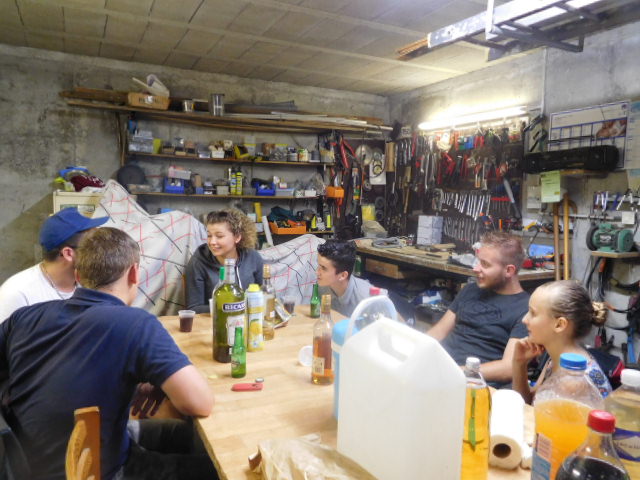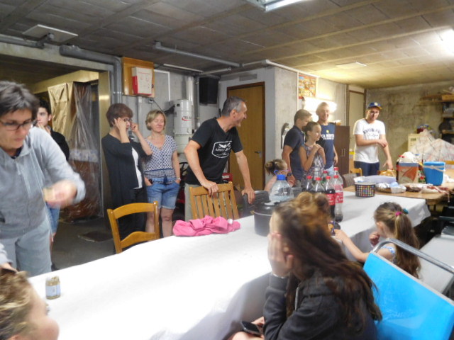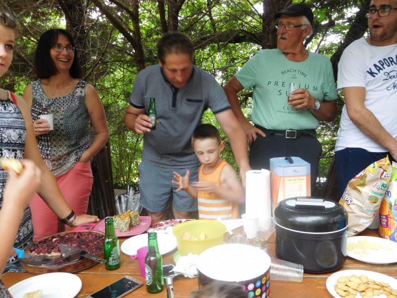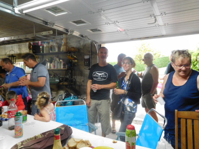 Apéro à midi près du jeu de boules mais la pluie nous a fait fuir dans un sous sol ou nous avons été sympathiquement invités.