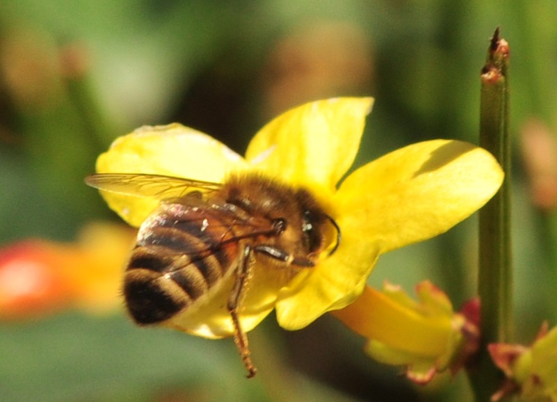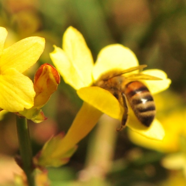 Le jasmin à fleurs nues est un arbuste sarmenteux aux longs rameaux souples, quadrangulaires et à écorce verte lorsqu’ils sont jeunes. Ils peuvent atteindre 2 à 3 m de longueur ce qui permet facilement de les palisser sur un treillage, une pergola, un vieux tronc…La plante peut également servir de couvre sol et est du plus bel effet plantée au dessus d’un mur duquel elle semble retomber en cascade. Les fleurs solitaires jaune vif et lumineuses apparaissent tout au long de l’hiver en fonction des températures très fluctuantes à cette période de l’année. Elles forment un tube assez long qui s’étale en 6 parties entièrement soudées ce qui fait que la corolle tombe d’une seule pièce. Le bouton floral est souvent nuancé de rouge bordeaux. Les abeilles sont moyennement attirées par ces fleurs à la «gorge» un peu trop profonde et donc mal adapté à la longueur de leur langue.