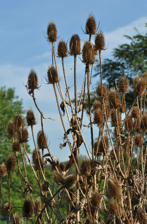 Le chardon à foulon n’est pas un vrai chardon. Il s’agit de la cardère sauvage (Dipsacus fullonum) de la famille des dipsacacées. C’est une plante très mellifère et très importante pour les petits passereaux et notamment les chardonnerets qui apprécient ses graines riches en huile.