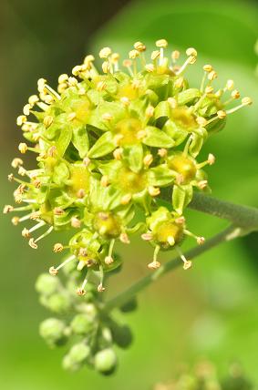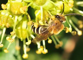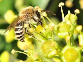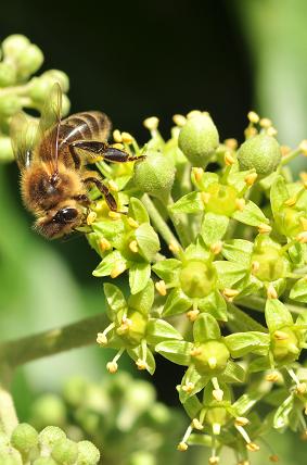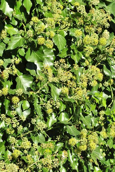 A l’inverse des arbustes indigènes, il fleurit en septembre – octobre et fructifie en fin d’hiver et au début du printemps. Les fleurs disposées en sorte d’ombelle ont une odeur plutôt désagréable mais produisent, à un moment crucial de l’année, un abondant nectar et un abondant pollen d’excellente qualité. C’est une véritable aubaine pour tous les insectes qui hivernent au stade adulte et qui doivent se constituer d’importantes réserves adipeuses pour affronter les rigueurs du climat. Pour les abeilles, cette notable rentrée en nectar et en pollen, stimule la ponte de la reine et entraîne l’apparition des générations d’abeilles d’hiver indispensables au moment de la reprise d’activité des colonies au premier printemps. Le lierre est également l’hôte exclusif d’une abeille solitaire qui porte donc nom, l’abeille ou collète du lierre (Colletes hederae). Les adultes apparaissent au moment de la floraison de leur hôte et les femelles récoltent uniquement son pollen et son nectar pour nourrir leurs larves souterraines. On dit que cette abeille très spécialisée est monolectique.